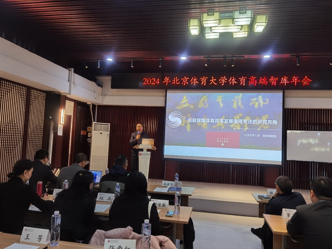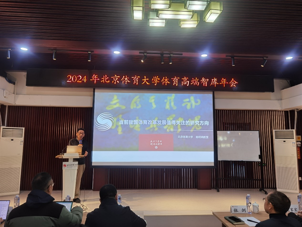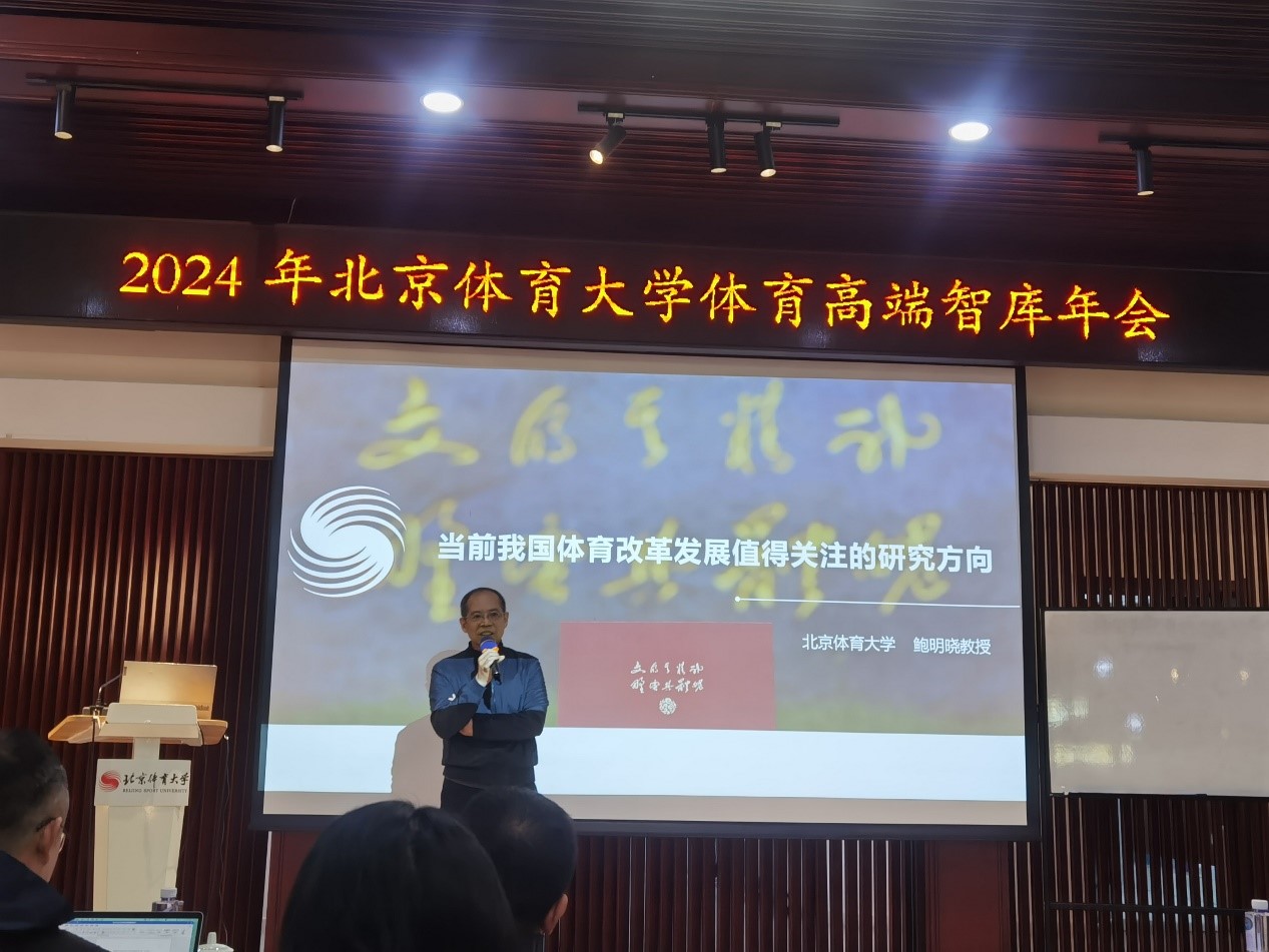 會議內容之一是對今年以來重要的研究成果進行匯報。北京體育大學鮑明曉教授從體育的宏觀研究、群眾體育領域、競技體育領域、體育產業領域等方面,以“當前我國體育改革發展值得關注的研究領域”為主題進行了報告。