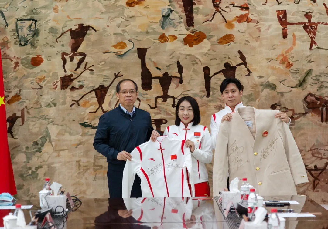 圖|黨委副書記、校長張劍代表學校接受隋文靜和韓聰的贈送的北京冬奧會入場服