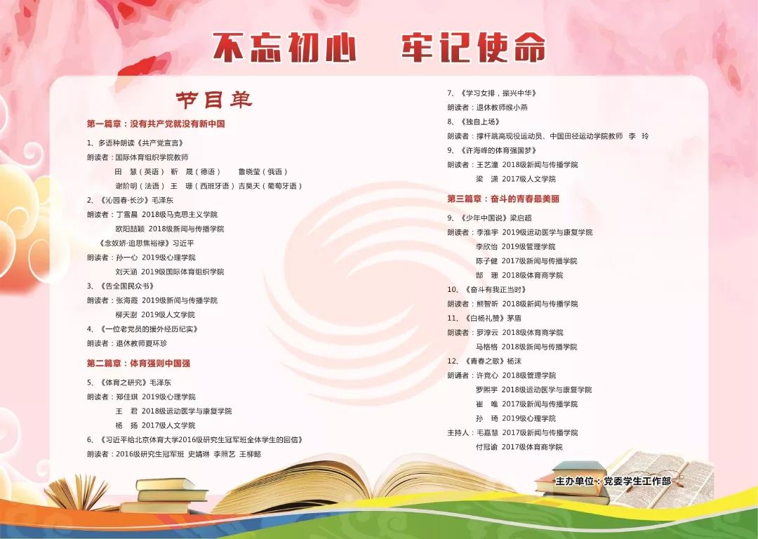 本屆金牌朗讀者活動分為“沒有共產黨就沒有新中國”“體育強則中國強”“奮斗的青春最美麗”三個篇章,展現了共產黨人“不忘初心、牢記使命”的拼搏精神。