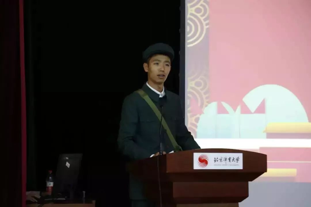 群眾大聯歡聯歡晚會團隊代表,來自藝術學院2018級的韓杰同學,用照片和視頻生動地為我們講述了他參與排練的原因、他們排練過程中的日常和小樂趣,會場內不時響起同學們的陣陣笑聲。其中,他特別介紹了一位帶傷也要堅持參加排練的同學,他表示,這位同學讓他十分敬佩,是“使命在肩,奮斗有我”的踐行者,是我們應該學習的榜樣。