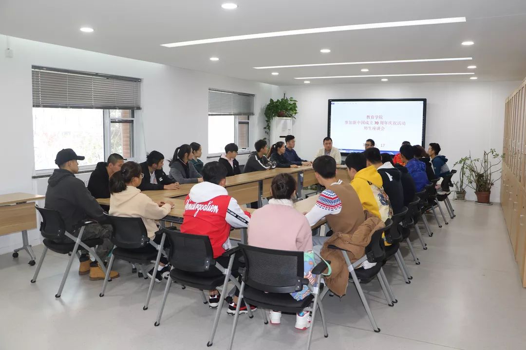 除國慶宣講外,教育學院組織參演學生召開了座談分享會。會上,6名參與國慶活動的學生代表相繼發言。他們表示,感謝學校創造的平臺,非常有幸能夠參加新中國成立70周年慶祝活動,能夠于國慶節當天在首都天安門廣場上為偉大的祖國慶祝生日。會上,大家對參演的同學們給予了極大的肯定,紛紛表示同學們面對困難不退縮、不放棄、不認輸、堅持不懈、頑強拼搏,認真完成了國家交代的任務,真正踐行了“使命在肩,奮斗有我”精神,值得每位同學學習。希望同學們以此為契機,搶抓機遇,接續奮斗,以優異的學業成績為祖國獻禮。