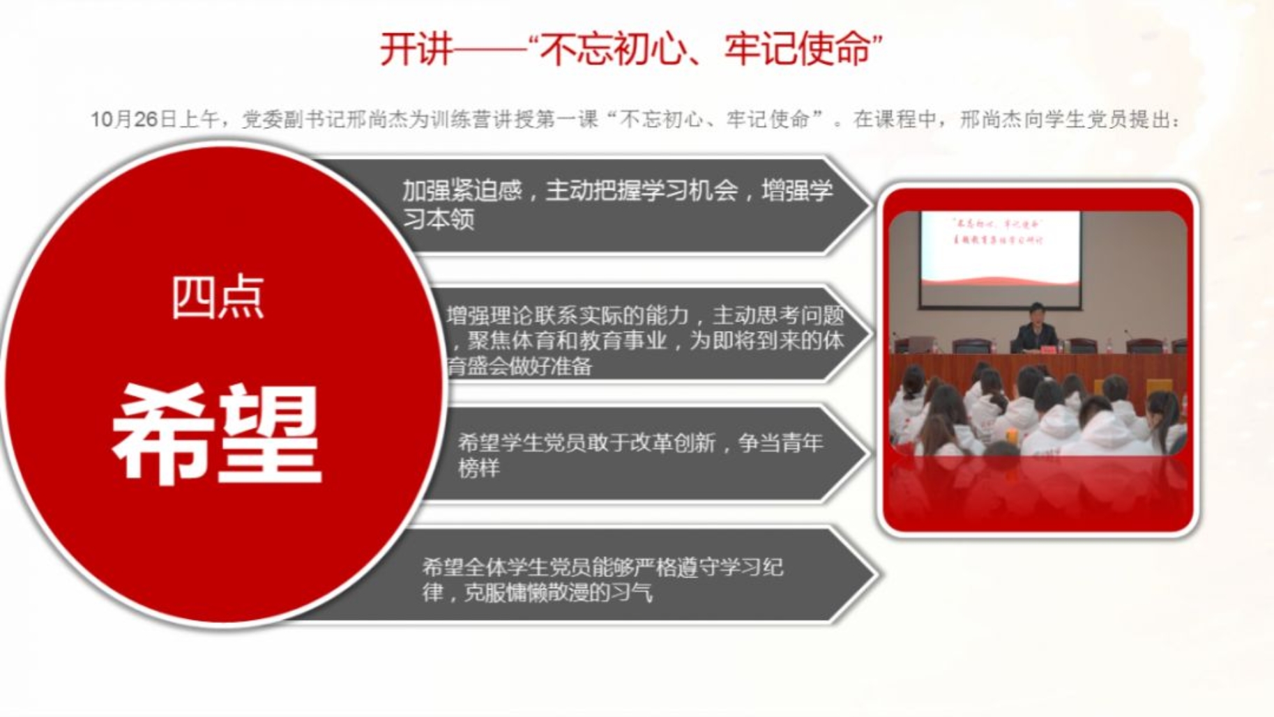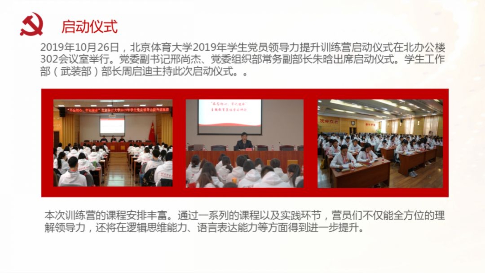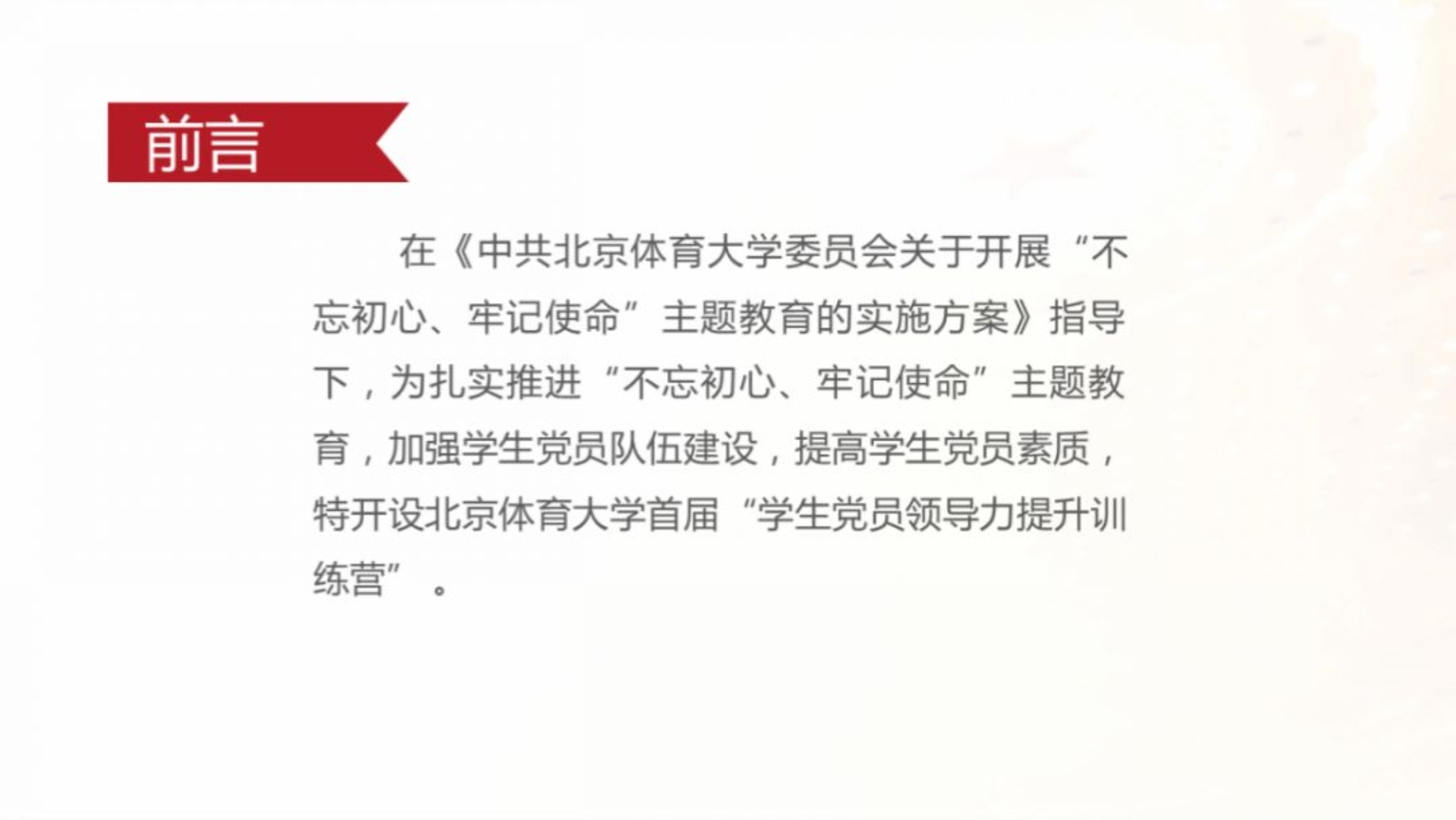 不忘初心,牢記使命。學生黨員爭當模范,將青春理想熔鑄于體育強國事業。北京體育大學首屆學生黨員領導力提升訓練營的課程已經暫時告一段落,但在訓練營中學習到的知識、建立的友誼將成為成長路上的又一筆財富。