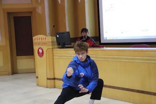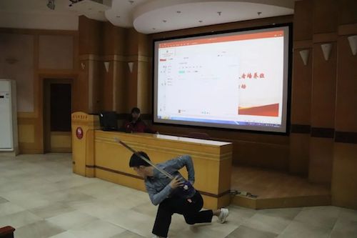 理論學習第一部分,第四期青馬班助管,中國武術學院2018級本科生邵銀霜做了武術推廣宣講。她從武術解釋、武術簡史、武術在以后的新發展新機遇三方面向同學們講授了武術相關知識,并提出了對于傳統武術和現代結合的期望。隨后,武術學院的同學帶來了一段精彩的武術表演。