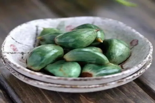 開水煮熟,外用染紅桃仁、杏仁、