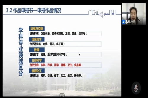 為積極備戰2021年“挑戰杯”課外學術科技作品競賽,校團委在第一期線上培訓順利舉辦的基礎上,于2月27日上午舉辦了“挑戰杯”第二期培訓會。本次培訓會由北京航空航天大學2020級碩士研究生杜坤榕同學主講。作為第十六屆“挑戰杯”全國大學生課外學術科技作品競賽特等獎獲得者,她圍繞參賽時間節點、項目申報準備材料、網絡申報流程等方面進行了詳細的講解,并對項目籌備提出建議,對同學們的有關疑問進行了解答。