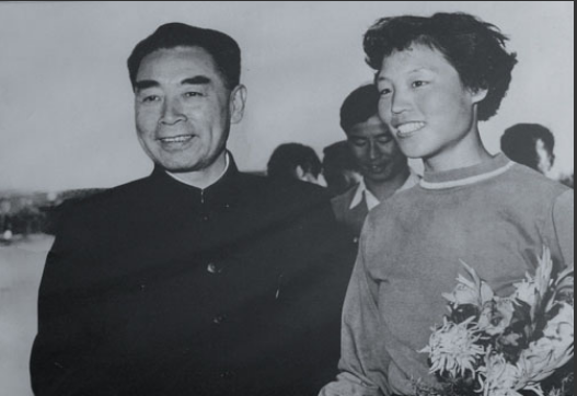 1957年10月20日,周恩來總理到北京體育學(xué)院田徑場觀看我校校友鄭鳳榮比賽后,在接見時(shí)送她一束鮮花。